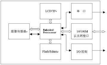 嵌入式視頻壓縮與網(wǎng)絡(luò)監(jiān)視系統(tǒng)主要由視頻信息采集端、數(shù)據(jù)壓縮編碼與傳輸以及客戶端解碼顯示等部分。圖1為系統(tǒng)前端采集和數(shù)據(jù)壓縮編碼部分硬件結(jié)構(gòu)框圖。其中,視頻信息由圖像傳感器如攝像頭進入系統(tǒng),經(jīng)A/D轉(zhuǎn)換后進入數(shù)據(jù)壓縮編碼環(huán)節(jié);數(shù)據(jù)壓縮編碼可以基于嵌入式處理器展開,處理器帶有相應(yīng)的接口及驅(qū)動,壓縮后的數(shù)據(jù)流可以由以太網(wǎng)送出?蛻舳酥恍璋惭b相應(yīng)的瀏覽器插件(集成了視頻解碼器),進行視頻數(shù)據(jù)的接收即可。