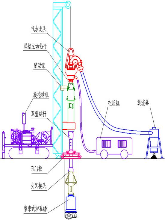 大口徑旋挖鉆機氣動潛孔錘反循環(huán)鉆具包括大通孔特殊結(jié)構(gòu)氣水龍頭、特殊雙壁主動鉆桿、雙壁鉆桿、轉(zhuǎn)換接頭、大直徑(單體、集束式)氣動潛孔錘等。當(dāng)雙壁主動鉆桿穿過旋挖鉆機動力頭時,即驅(qū)動下部連接的雙壁鉆桿、交叉接頭、集束式氣動潛孔錘反循環(huán)鉆進(jìn)?卓谠O(shè)計有特殊的孔口裝置供提下鉆具用。當(dāng)巖屑沿中心通道上返至氣水龍頭排渣管,進(jìn)入專用的除塵旋流器時,可充分體現(xiàn)此種鉆進(jìn)工藝入巖效率高、成孔質(zhì)量好、環(huán)保清潔、成本低。