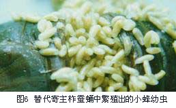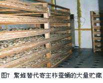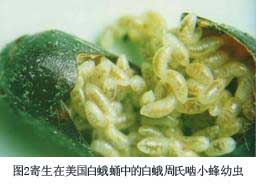 7 研究篩選出繁殖美國白蛾的替代寄主,解決了白蛾周氏嚙小蜂人工大量繁殖的技術(shù)瓶頸,做到了規(guī);狈浜统D攴狈,為利用這種天敵進行大面積防治創(chuàng)造了條件 通過對11種不同的寄主試驗篩選,找到了良好的繁蜂替代寄主――柞蠶 (Antheraea pernyi) 蛹,使繁蜂量提高了近100倍,并試驗解決了柞蠶蛹的長期保存問題,達到了常年繁蜂和規(guī);狈;還研究解決了蜂種復(fù)壯問題,保證了人工繁殖出的小蜂的質(zhì)量[21]。