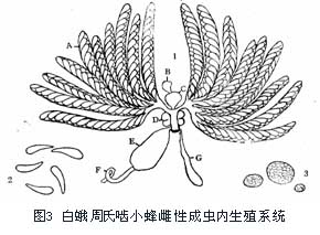 (1. 雌內(nèi)生殖系統(tǒng); 2. 卵; 3. 營養(yǎng)體顆粒; A卵巢管; B受精囊腺;
