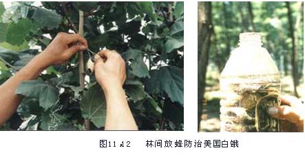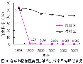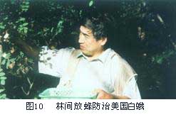 8 研究確定了放蜂防治美國白蛾的最佳蟲期、放蜂量和放蜂次數(shù),總結(jié)出了一套行之有效的放蜂防治技術(shù) 放蜂最佳蟲期為美國白蛾老熟幼蟲期和化蛹初期;放蜂量按經(jīng)驗公式TN=W·AN·3計算;放蜂次數(shù)采用每代美國白蛾放蜂2次共放蜂4次。經(jīng)過放蜂的地區(qū),白蛾周氏嚙小蜂的最高寄生率達88.02%。由于放蜂防治區(qū)禁止使用化學(xué)農(nóng)藥,因而保護了其它天敵,使這些天敵的種群數(shù)量大大增加。因此,白蛾周氏嚙小蜂和其它多種天敵的總寄生率最高達96.28%,平均92.3%。經(jīng)過連續(xù)2代4次放蜂,使美國白蛾的有蟲株率降到了0.1%以下,有效地控制了美國白蛾的危害,達到了有蟲不成災(zāi),并達到了持續(xù)控制的顯著防治效果[21]。