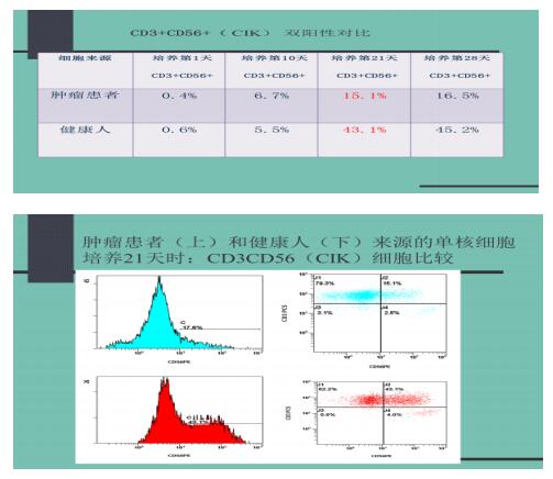 2.細(xì)胞增殖速度快、數(shù)量多:同樣培養(yǎng)時(shí)間內(nèi),健康人CIK 細(xì)胞是腫瘤患者的6倍(下表),CD3CD56 雙陽(yáng)性細(xì)胞數(shù)量是腫瘤患者的2倍。