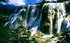 九寨溝的瀑布很有特點(diǎn),以樹正群海溝溝尾的諾日朗瀑布為例,它是透過樹叢縫隙而溢漫出來的。人們可見在那約百米寬的瀑布頂端,齊嶄地長著一排水柳,枝葉攀搭,組成一堵綠色的墻。綠墻下端的樹干間隔有序,宛如一把長梳的梳齒,晝夜不停地梳理著經(jīng)久不息的流水。 九寨溝最為奇特的瀑布還屬曰則溝的珍珠灘瀑布。它的石灘在一處峭壁上方,好似斜掛于天際。灘上被萬年流水融成的許多圓形坑洞,經(jīng)急速的流水沖進(jìn)又反彈出而形成許多飛舞的水珠,它們一排排,一串串,一層層,大的如皮球,小的如彈子,個(gè)個(gè)晶瑩透亮,尤其是經(jīng)陽光的反射,就像一顆顆帶彩的珍珠。
