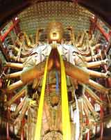 位于承德市避暑山莊之北,因寺內(nèi)有木雕大佛,又稱(chēng)大佛寺,建于清乾隆二十年至二十三年(1755~1758年)。此寺仿西藏三摩耶廟形式而建。按佛教教義關(guān)于世界構(gòu)造的模型布局,中央的大乘閣象徵須彌山,四周的殿宇象徵四大部洲。安遠(yuǎn)廟是仿新疆伊犁固爾扎廟修建。普陀宗乘之廟和須彌福壽之廟,前者信拉薩布達(dá)拉宮后者仿扎什倫布寺修建。這些建筑藝術(shù)形象既反映了民族團(tuán)結(jié),又起到了民族間建筑文化交流的作用。山莊周?chē)聫R,環(huán)山莊半圓建成,呈眾星捧月之勢(shì),政治寓義十分明確。從收效看也確實(shí)是“一座喇嘛廟,勝抵十萬(wàn)兵”。 全寺占地約2.3萬(wàn)平方米,主要建筑有鐘鼓樓、碑亭、天王殿、大雄寶殿、大乘閣等。大乘閣高36.75米,外觀(guān)六層重檐。閣內(nèi)置木雕千手千眼觀(guān)音貼金立像,高22.23米。用松柏榆杉椴五種木材雕成,是國(guó)內(nèi)現(xiàn)存的最大木雕佛像之一,已經(jīng)被錄入《吉尼斯大全》。佛像兩側(cè)有善財(cái)、龍女侍立,造型圓潤(rùn)。閣兩側(cè)有妙嚴(yán)室和講經(jīng)堂,分別是清帝聽(tīng)經(jīng)和休憩之所。