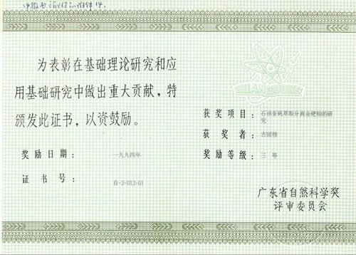 1996年,在萃取化學(xué)領(lǐng)域拼打了二十年的古國(guó)榜又開辟了一個(gè)新的研究方向,二氧化鈦光催化降解環(huán)境有機(jī)污染物 的研究。經(jīng)過十年努力,2006年“二氧化鈦光催化環(huán)境技術(shù)的應(yīng)用基礎(chǔ)研究”獲廣東省科學(xué)技術(shù)一等獎(jiǎng)。