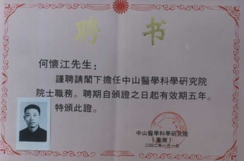 何懷江還先后獲得“世界名醫(yī)”、“全國醫(yī)藥界精英”等榮譽 。業(yè)績被收入《世界名中醫(yī)》、《中國專家大辭典》、《當(dāng)代醫(yī)藥界名人錄》、《中國專家人才庫》等書中。被世界衛(wèi)生組織授予“國際傳統(tǒng)醫(yī)藥杰出學(xué)者”稱號。被臺灣“中山醫(yī)學(xué)科學(xué)研究院”聘為院士。